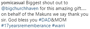 Comedian AY’s younger brother, Yomi gave a big shout out to Kunle Churchill yesterday for donating a fat cow to the Makuns for the 17th year remembrance of their late parents.