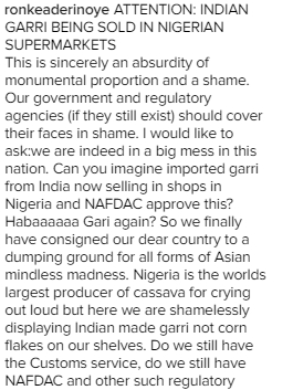 TRS Gari: Outrage As NAFDAC Approves Indian Garri To Be Sold In Nigerian Supermarkets