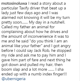 Motosinoluwa said the Uber driver simply identified as Olatunbosun pulled her hair, gave her a butt slap and twisted her finger after he dropped her halfway for complaining about the way he was driving.