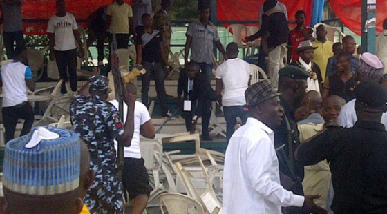 During the chaos captured by FG-owned Nigerian Television Authority, NTA, chairs, bottles and other items were used by the warring factions of the party to attack each other.