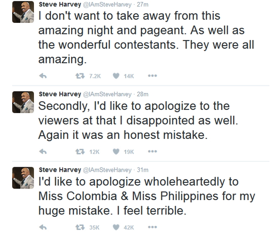 “Okay folks, I have to apologize. The first runner-up is Colombia. Listen folks, let me just take control of this. This is exactly what’s on the card,””I will take responsibility for this. It was my mistake. It was on the card. Horrible mistake. It is my mistake.”Please don’t hold it against the ladies. We feel so badly but it’s been a great night.”
