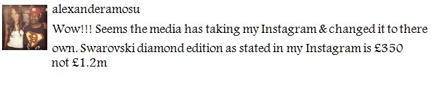 “Wow!!! seems the media has taking my instagram & changed it to there own. swarovski diamond edition as stated in my Instagram is £350 and not £1.2m”