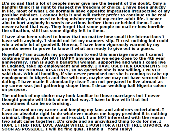 The insider added that Fran a single mother of one married Yomi Fabiyi out of desperation for love and has helped him to renew his UK visa for over 3 years now.