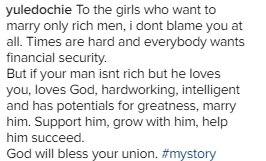 The actor took to the social media yesterday to share his minds with single ladies who would rather marry extremely wealthy men instead of men they will grow with.